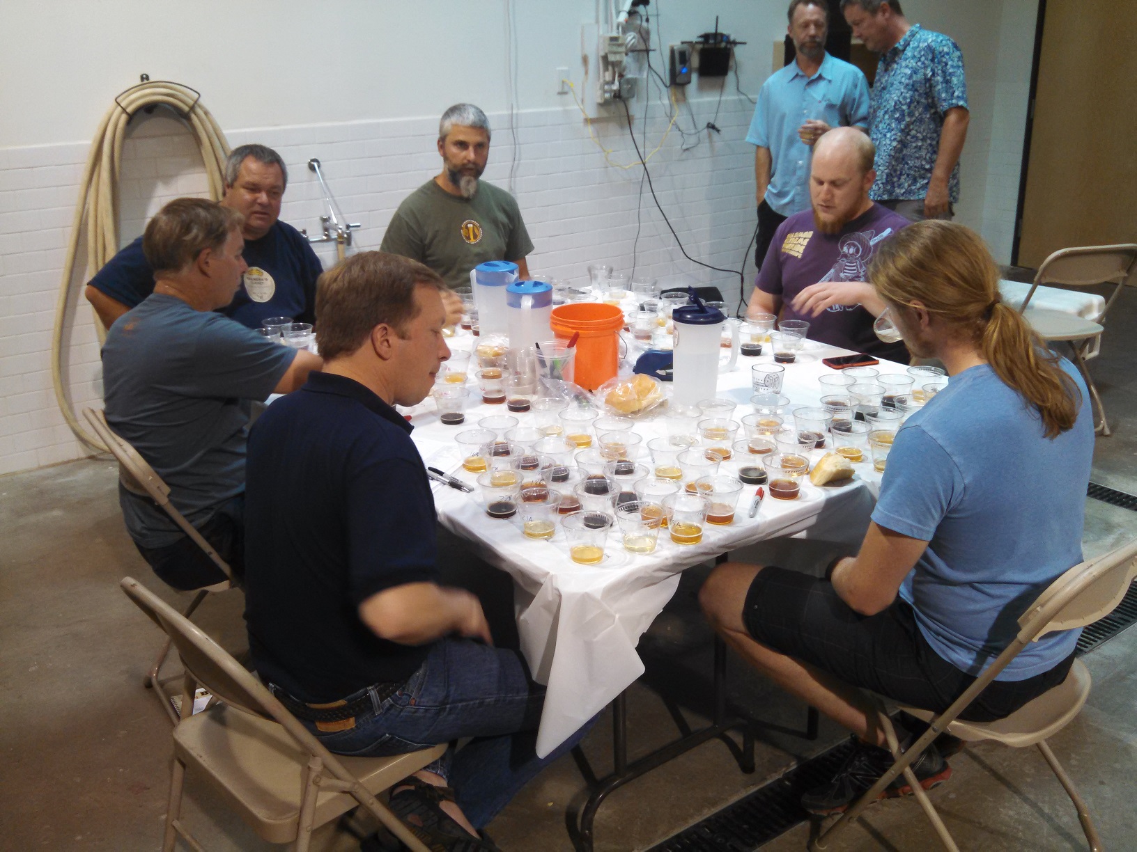 To avoid the longest caption in history with the photo, here are the IDs for those at the table, listed counter-clockwise: Patrick Johnson (light blue shirt) certified BJCP judge, Andrew (purple shirt) first-time judge, Jason Kirkman (green shirt) provisional BJCP judge, John Rowley (black shirt) accomplished home brewer, Kevin Fleming (grey shirt) accomplished home brewer, and Mike Hall (dark blue polo) national BJCP judge. Standing watching over table the are David Hargis (solid blue shirt) Tractor’s head brewer and Karl Gass (patterned blue shirt) experienced judge.