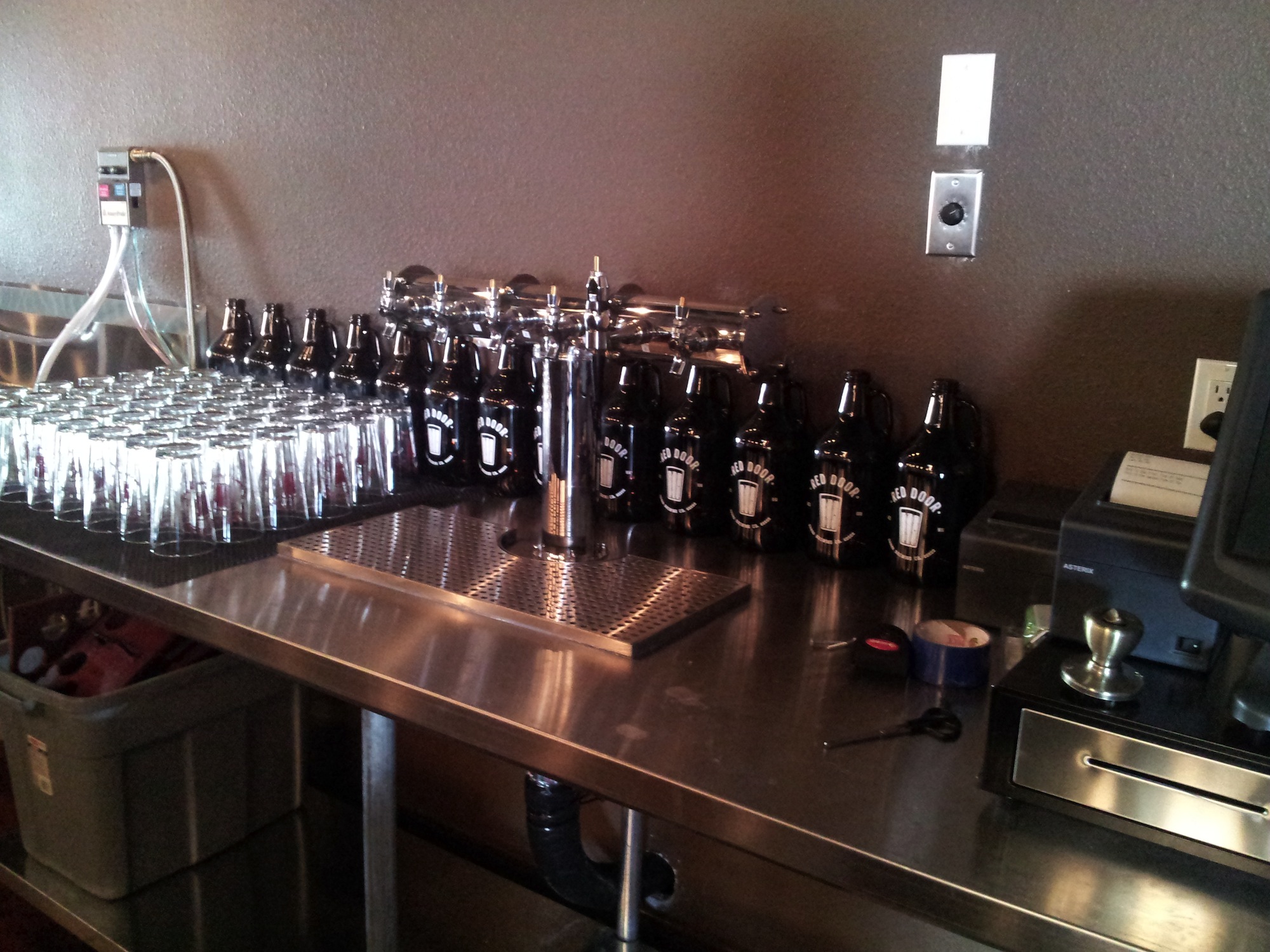 So, yes, Red Door will open its doors Wednesday from 2 p.m. to 10 p.m. (UPDATE: our earlier report that it’s opening Tuesday was off, that’s a special invite-only day for close friends of the brewery … and us, too), with the bigger shindig planned for Friday, running from noon to midnight. The good news is Red Door looks to be ready for the onrush of beer lovers who will descend upon its location at 1001 Candelaria NE (just west of I-25, on the north side of the street). The taproom should have room for about 95 people. The bar has plenty of space and they had a slew of glasses and growlers ready to go (not to mention a rather awesome wall decoration of growlers from all over America).
