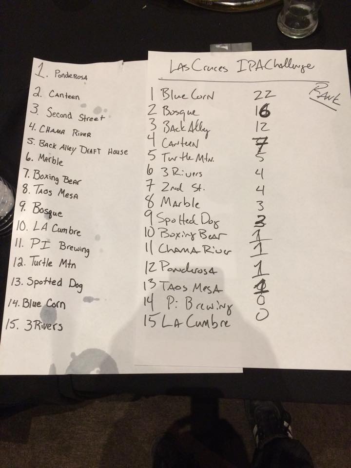 The second round of the NM IPA Challenge went down at Pecan Grill and Brewery on Wednesday night in Las Cruces and it featured a few surprises. First-round leader Marble scored just three votes after racking up 38 in Santa Fe last Saturday and now drops to third place. Everyone that was shocked at La Cumbre garnering just four votes in round one will further be floored after they got zero votes in Las Cruces.