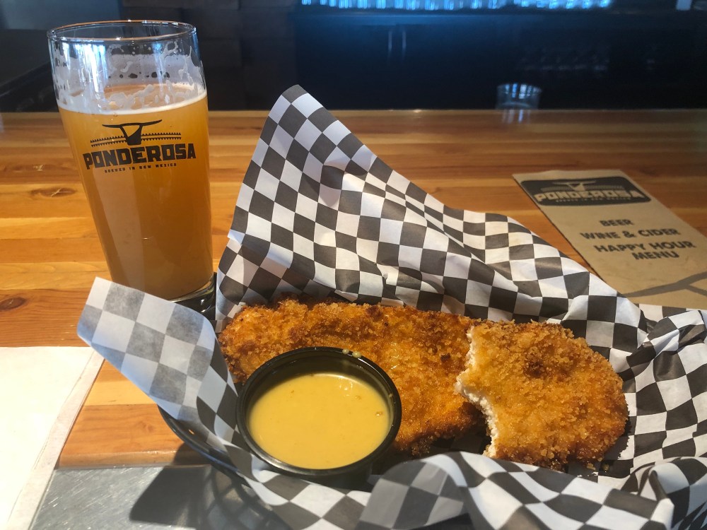 I followed it up with a second course (hard to refuse with the happy hour deals) consisting of chicken tenders and a Hop-Mosa. The chicken tenders were a step down from the sliders but still competitive with some of the better tenders I have had. The Hop-Mosa lived up to its name. This was Hop-Mosa 3.0, Ponderosa’s third take on a NE Hazy IPA. The mouthfeel was creamy, with a definite orange juiciness. The visit was worth it just for this beer.