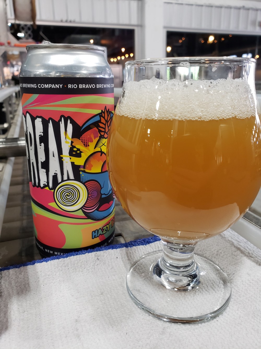 Freak Juice (6% ABV, 40 IBU) was made with 60 pounds of hops, and then an additional 60 pounds on the dry hop. Citra, Mosaic, and Amarillo are the hops in question. I got a quick sample and it is an aggressive hazy IPA, with a big aroma.