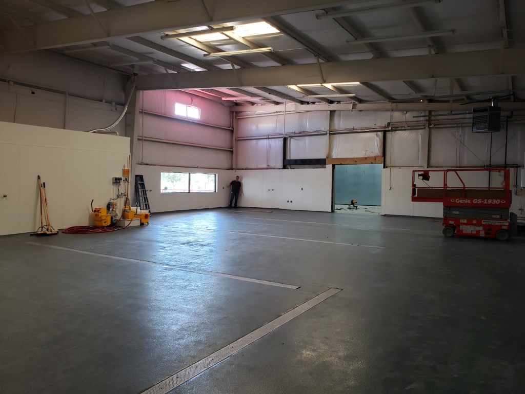 The main brewing floor is done, with the trench drains ready. One can envision where the brewhouse and rows of fermenters, both 10- and 20-barrel, will go. There was some debate among the brewers as to whether or not they would keep the current 10-barrel brewhouse, but ultimately they decided to stick with it, Davis said. He noted that getting to between 7,000 and 8,000 barrels per year is the goal, and Boxing Bear can do that with the current brewhouse.