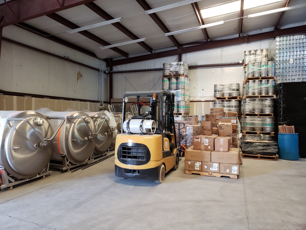 Co-owner Kevin Davis led me into the back area, which is still under construction/renovation to transform it into a functional brewery. The massive walk-in cooler on the west side was still being completed. The main glycol chilling unit has not yet arrived, either. There are some new fermenters and brite tanks waiting in the storage area, where stacks of cans are also standing. Eventually, Davis told me that they will be able to order enough cans at a time to have their year-round offerings printed, instead of attached labels like they have now.