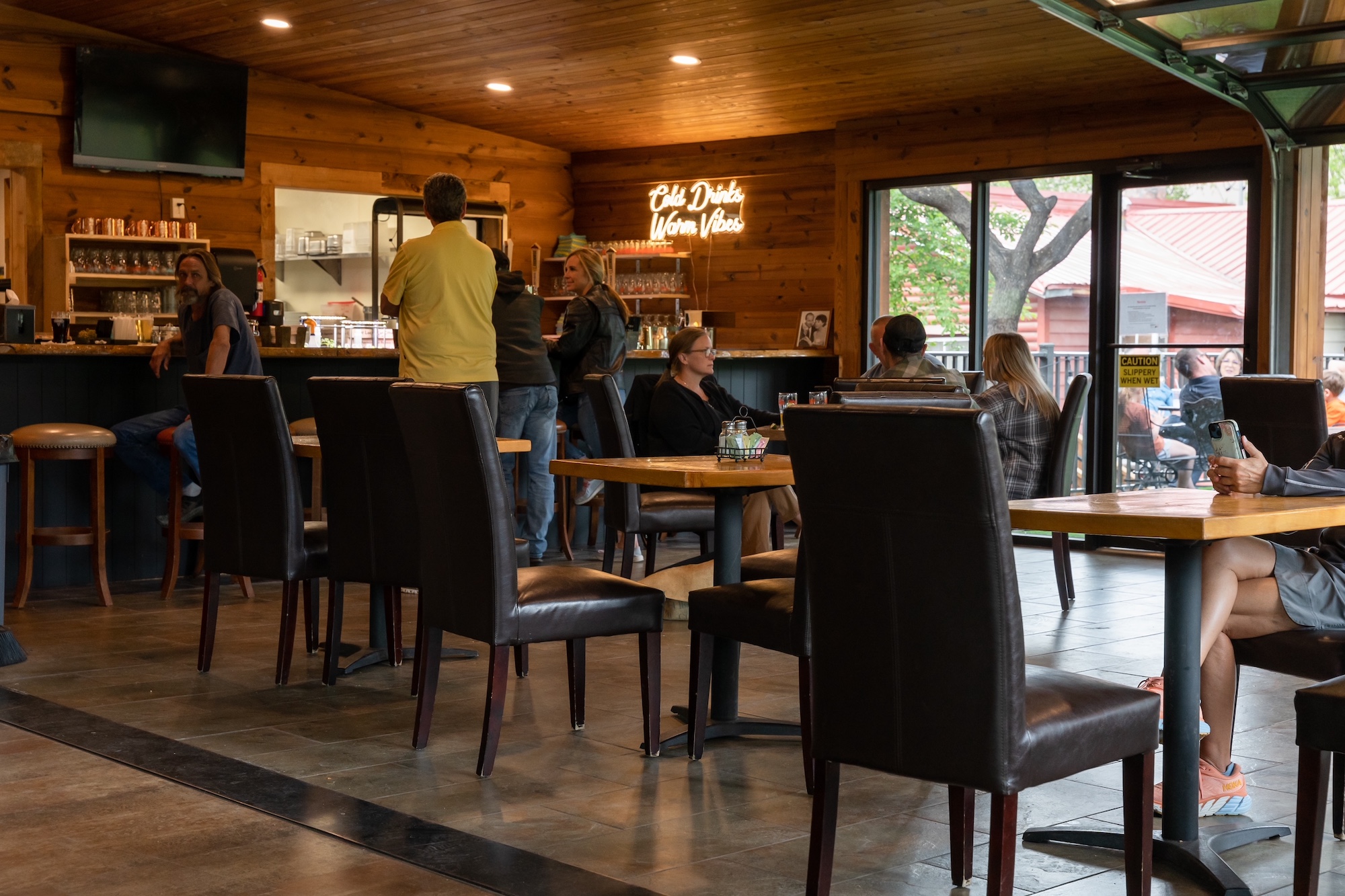Downshift Riverside had its official grand opening on Memorial Day weekend, but it was already abuzz the weekend before when we visited. The building feels like it is only one floor when you look from Sudderth, the main road through Ruidoso, but it is built on a hill overlooking the Noisy Water River, so it slopes down. There are multiple outdoor decks, one on the west side where we conducted the interview, and on two separate levels on the north side looking down on the river. The interior features multiple separate rooms, including one that is more for dining, one by the bar, and one for watching live music. It features a full kitchen, the entire Downshift beer lineup of year-round and current seasonal offerings, and a to-go fridge with canned beers.