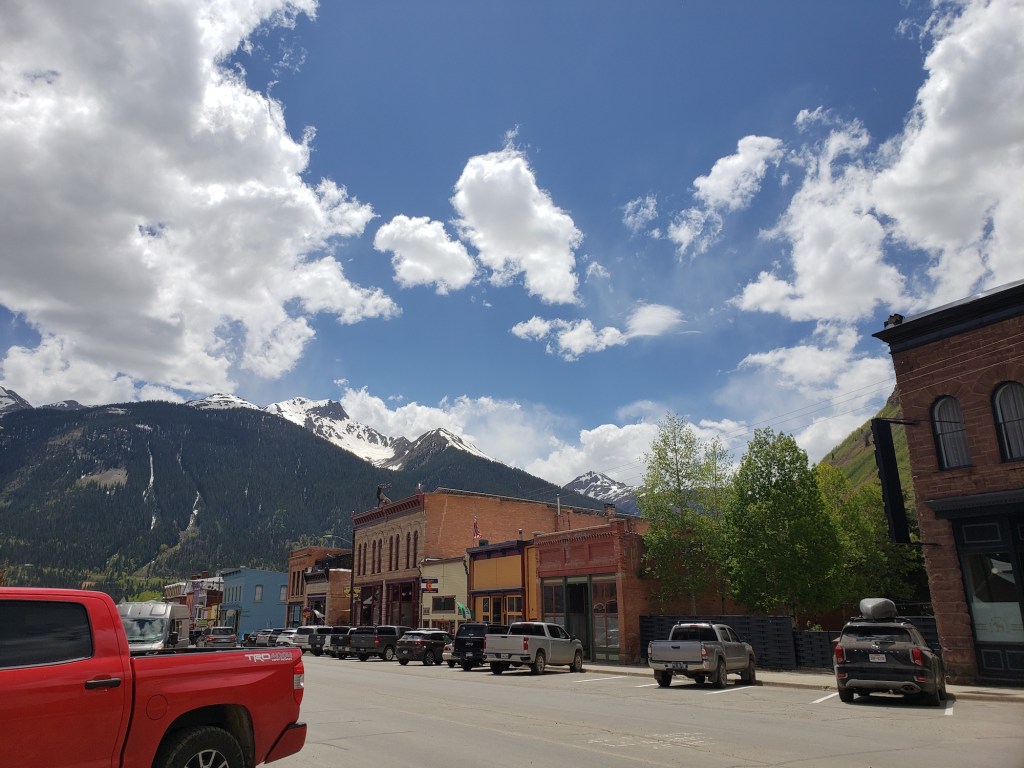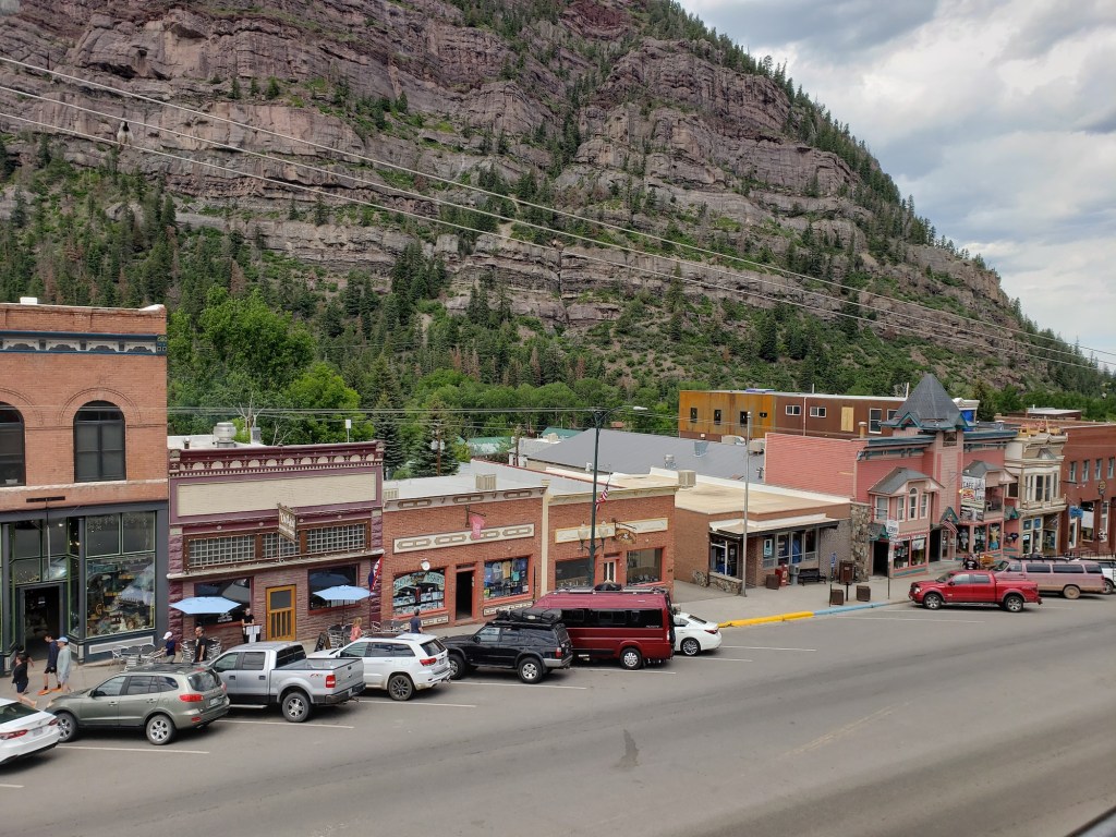 Ouray was a pleasant little town, rustic and modern at the same time. The wide main street area is pedestrian friendly, with plenty of free parking. There were a lot of summer adventure types, with kayaks and mountain bikes, or climbing equipment for the nearby sheer rock faces of the canyon.