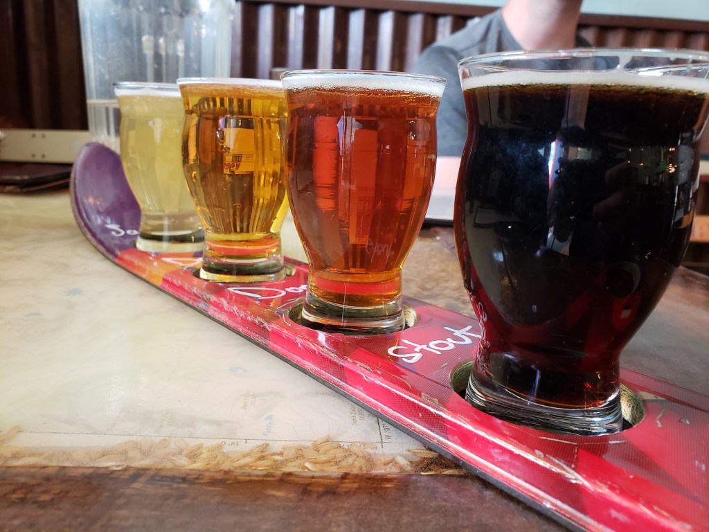 Part of the reason we stopped was to see where local stalwart Avalanche Brewing moved to on Main Street. Previously tucked away on a side street, it now sits smack dab in the middle of town. We found a (free) parking spot and walked over. It wasn’t terribly busy in the late afternoon, so Luke and I both ordered flights. They are served on these clever miniature skis.