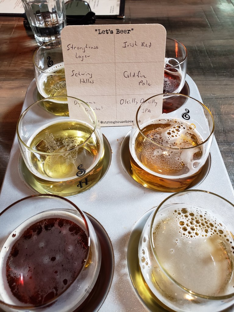 Luke and I both ordered flights, which had six beers each, and man, were these things beastly. I went with the StrongHouse Lager, Schwing! Helles, Dynamo Dunkel, Irish Red, Coldfire Pale Ale, and Okilly Dokilly IPA. I’ll admit, the last one was for The Simpsons reference.