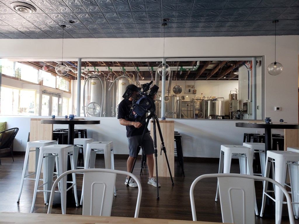 Co-owner/brewer Jeff Tomlinson was in the brewery, being interviewed by KOB reporter Tamara Lopez and photographer Adan Rodriguez. The staff were back by the bar, discussing strategy.