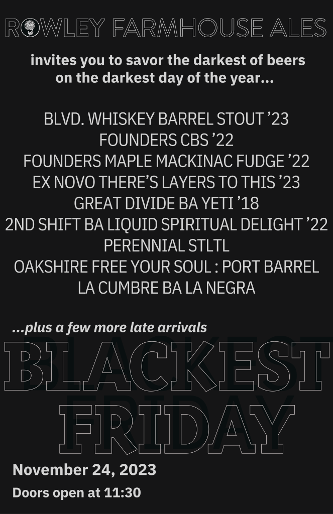 It’s not always easy to tell when stout season has come to Santa Fe. Some might say it begins with the first seasonal closing of a taproom patio. Some might say it arrives with the first frost-covered windshield. Some, with the first obligatory swarm of “It’s Snowing!” posts on Facebook. And for the Dark Side Brew Crew, it’s always stout season. But I like to think that for the rest of the good beer-loving folks of the City Different, stout season officially kicks off with Blackest Friday, the annual celebration of big, barrel-aged imperial stouts at Rowley Farmhouse Ales.