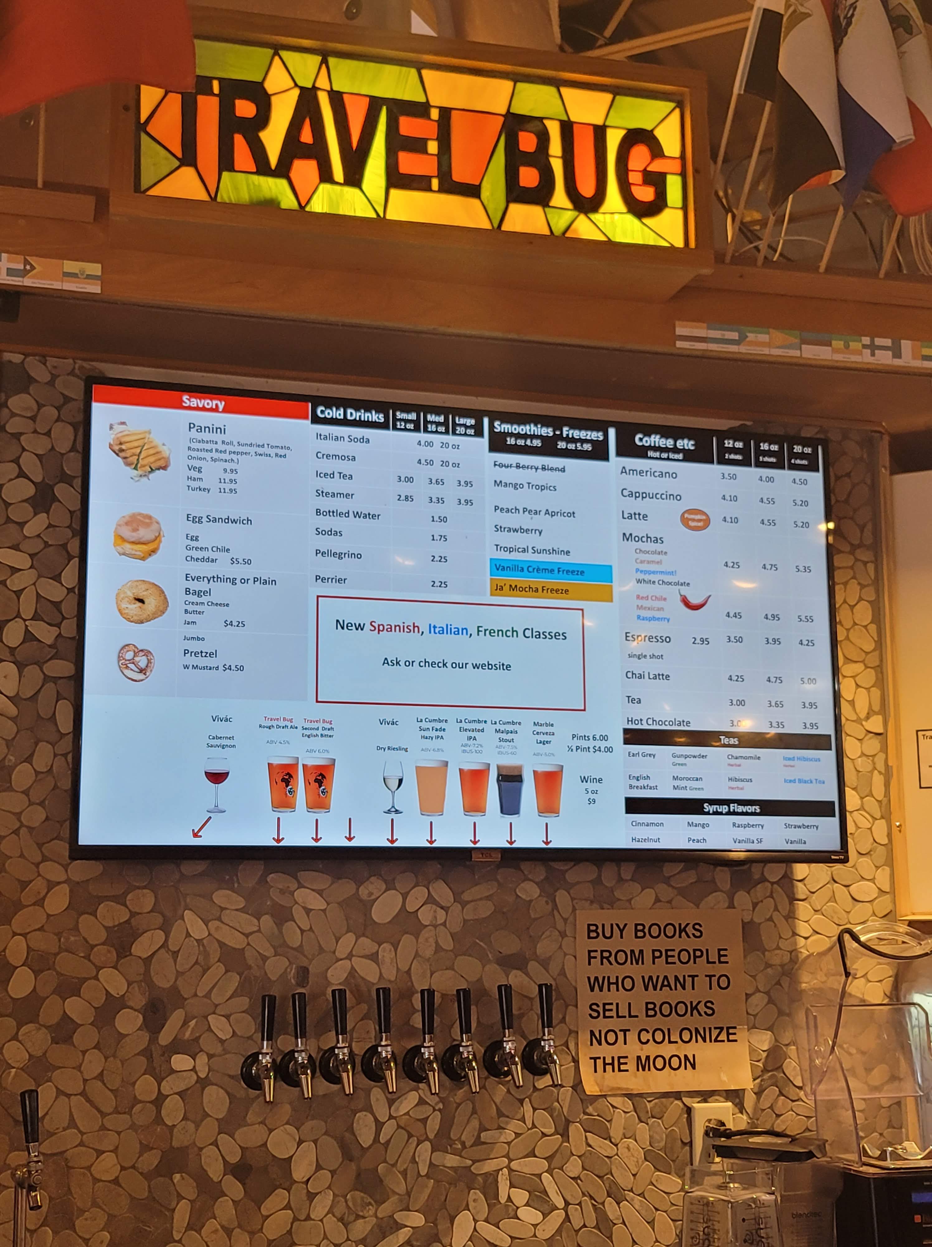 Santa Fe has nowhere near the number of breweries that Albuquerque has, but there’s one more than you probably realized. Travel Bug, a charming store specializing in all sorts of travel-related merchandise and books, recently began brewing their own beer. They had been serving coffee drinks, pastries, and sandwiches, but owner Greg Ohlsen decided that expanding into alcohol sales might be fun to do, and also good for his bottom line.