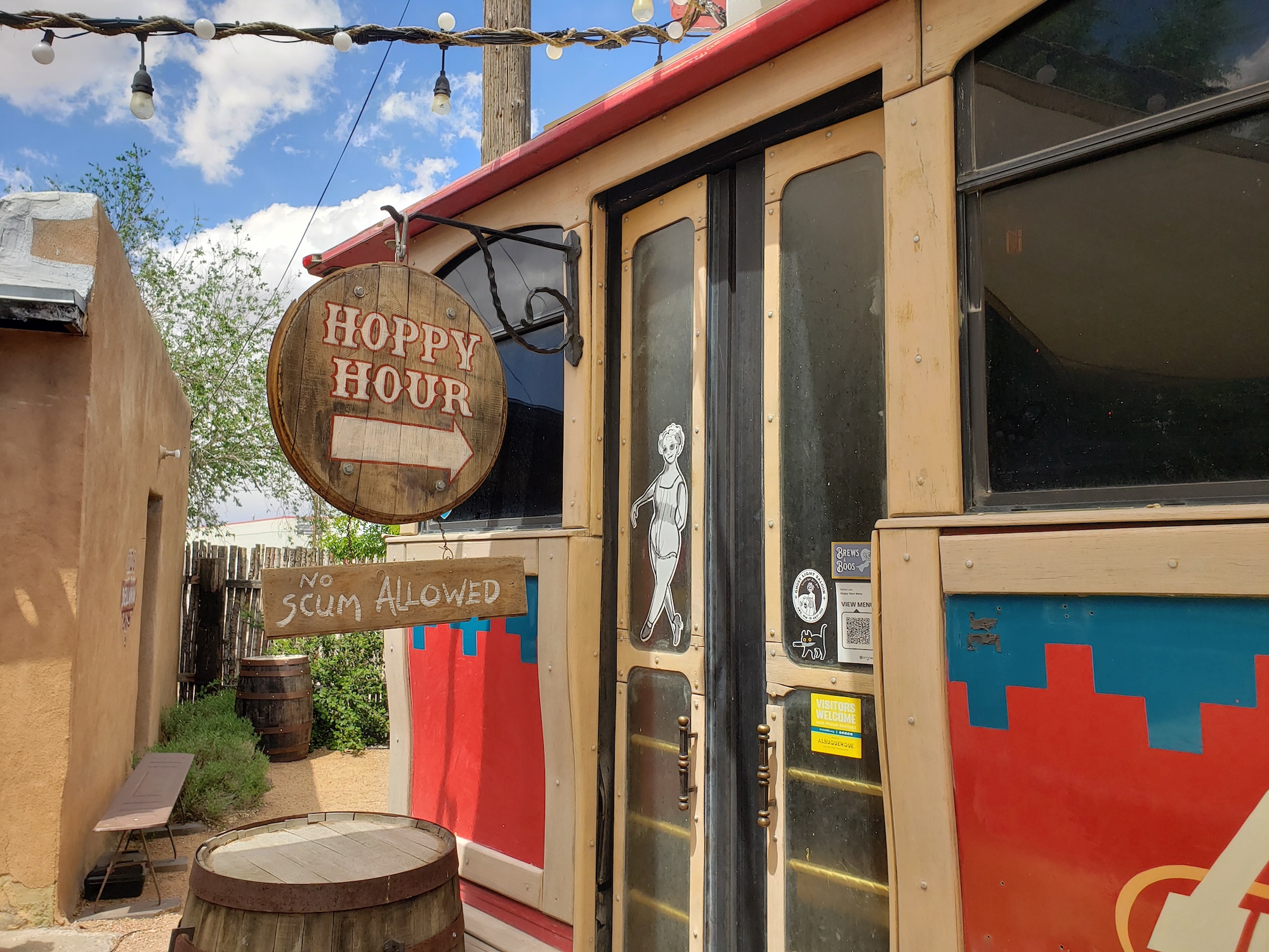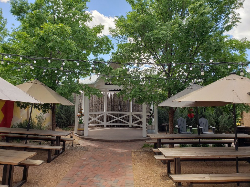 Now, as we have noted before, one does not have to be an overnight guest of Painted Lady to enjoy a pint or two on the property. Whether inside the Ghost Light Saloon, which occupies an old Albuquerque Trolley, or outside on the patio near the brand-new gazebo, “hoppy hour” patrons can mingle alongside those spending the night in a nearby room.