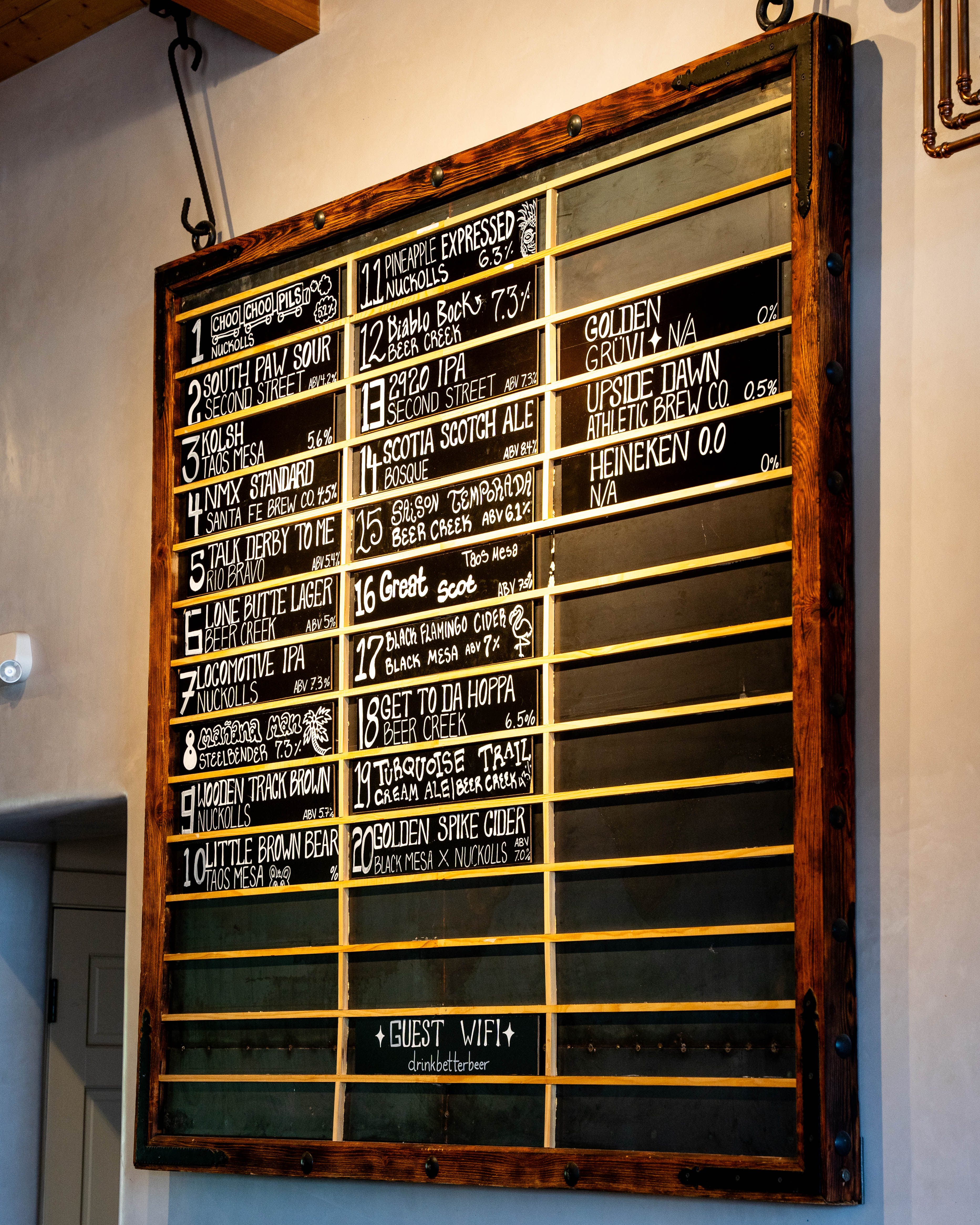 Upstairs, the beers and ciders are entirely local, ranging from Albuquerque to Taos and serving some of Santa Fe’s best along with them, as well as plenty of other non-alcoholic choices.