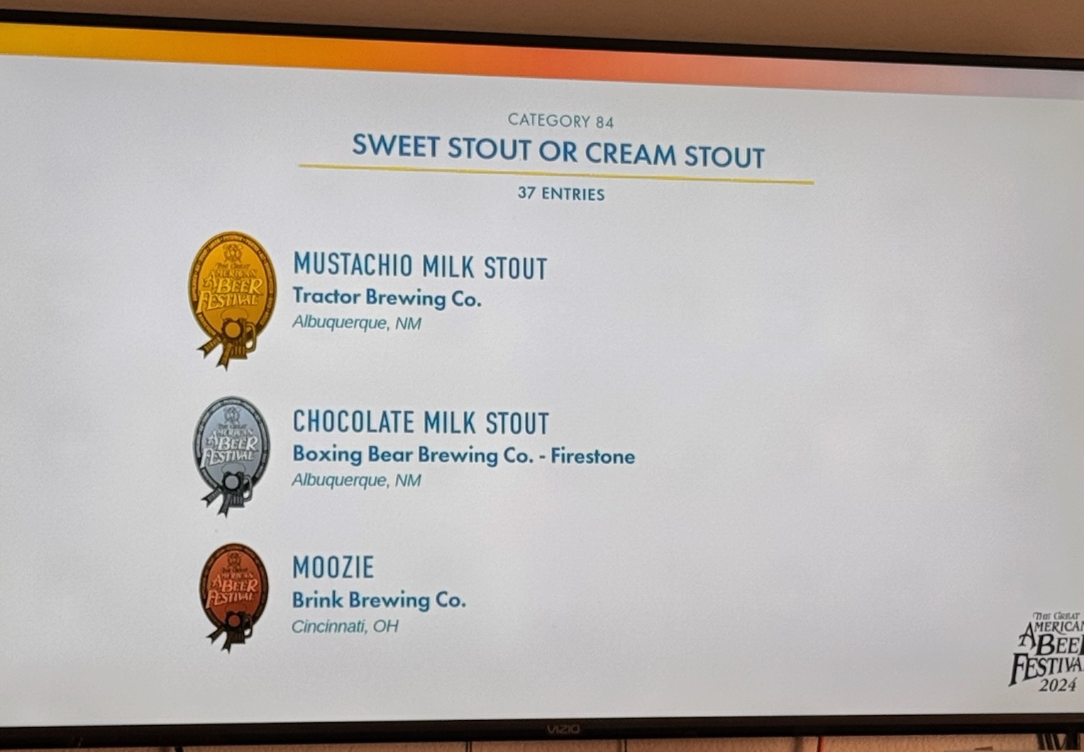 Tractor Brewing won their first gold medal, and first GABF medal of any kind, for Mustachio Milk Stout in the Sweet or Cream Stout category. It topped a field of 36 other stouts.