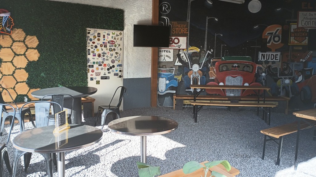The back area which used to provide workshop space for people to service their motorcycles was repurposed for a while into an art space. Now, their big initiative for 2025 is they are in the process of finding a vendor for a kitchen space. Since they are also a coffee shop, and therefore open early, more food will be a great addition for those of us *ahem* who can be talked into a breakfast beer!