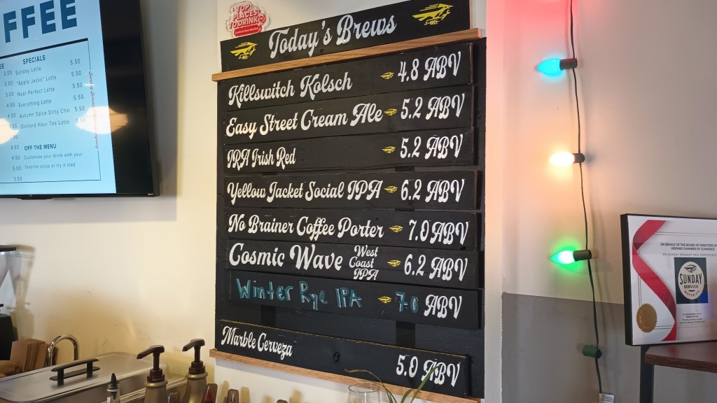 I asked Kevin about owning a brewery that is also a coffee shop. I wondered what the breakdown is for coffee versus beer. He said as far as orders, they are pretty even. But there’s less revenue on the coffee side. The numbers would be between 30-40 percent for coffee and 60-70 percent beer, wine and alcohol (they do sell a bit of wine and make a few cocktails). There’s also a volume issue. You might stay a while and have a coffee, but you are more likely to hang out and have more than one beer.